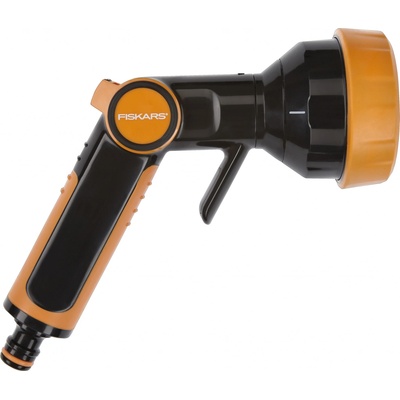 otáčením hlavy pistole lze nastavit 3 tvary proudu vody: tryska, sprcha a mlha, lze plynule nastavit od největšího průtoku až po zastavení vody Zavlažovací pistole Fiskars...