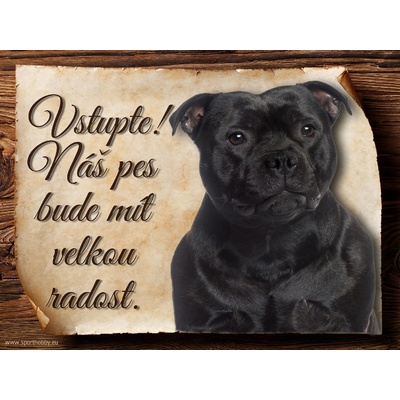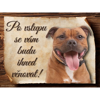 Cedulka Stafordšírský bulteriér, hliníková s nápisem "Vstupte! Náš pes bude mít velkou radost!" Kovová výstražná venkovní cedulka oznamující to či ono, že se ve vašem obydlí...