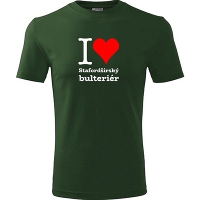 Lahvově zelené tričko I love Stafordšírský bulteriér. nabízené velikosti jsou S,M,L,XL,XXL,XXXL. Tričko patří do kategorií Dárek pro pejskaře, . Technologie potisku: Tisk na...