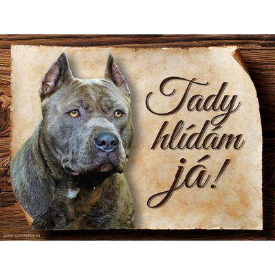 Cedulka Americký stafordširský teriér II, hliníková s nápisem "Tady hlídám já!" Kovová výstražná venkovní cedulka oznamující to či ono, že se ve vašem obydlí může návštěvník...