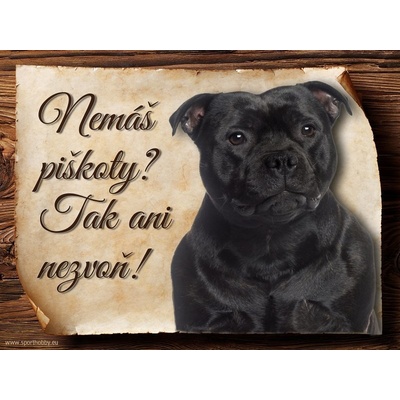 Cedulka Stafordšírský bulteriér, hliníková s nápisem "Nemáš piškoty? Tak ani nezvoň!" Kovová výstražná venkovní cedulka oznamující to či ono, že se ve vašem obydlí může...