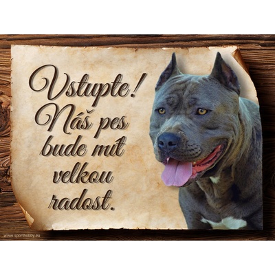 Cedulka Americký stafordširský teriér I, hliníková s nápisem "Vstupte! Náš pes bude mít velkou radost!" Kovová výstražná venkovní tabulka oznamující to či ono, že se ve vašem...