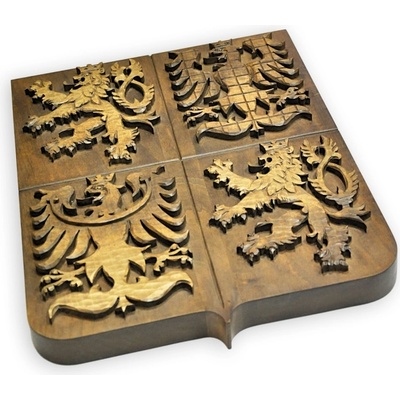 Umělecky vyřezávaný dřevěný velký státní znak ČR v plastickém provedení, kde jednotlivé figury vystupují do prostoru.