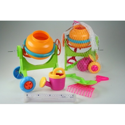 Plastová míchačka cca 27x28cm s konvičkou, hrabičkami a lopatkou.Věk 3+