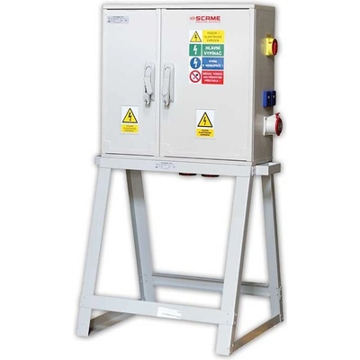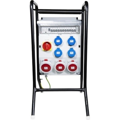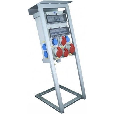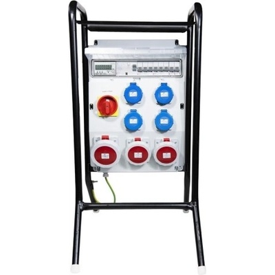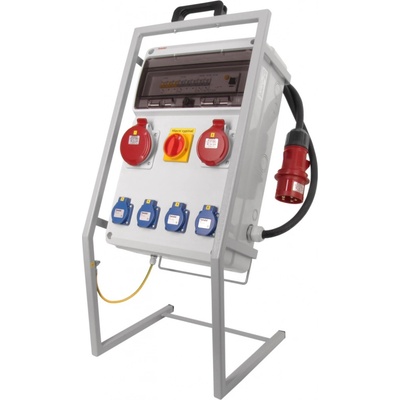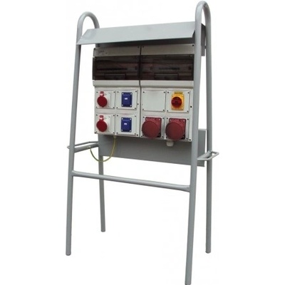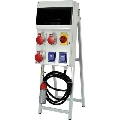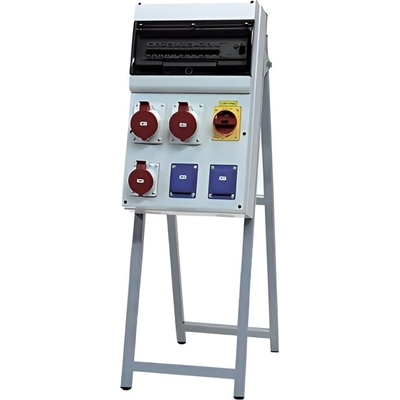 Zásuvkový staveništní rozvaděč na stojanu řady DST. Osazené zásuvky 3x 230V/16A, 1x 400V/16A/5p, 3x 400V/32A/5p, 1x 400V/63A/5p. Jištění 3xB16/1, 1xC16/3, 3xC25/3, 1xC63/3,...