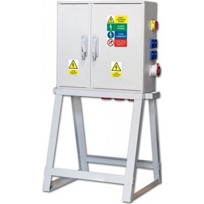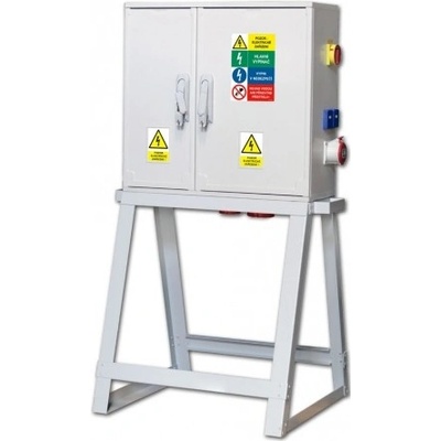 Zásuvkový staveništní rozvaděč na stojanu řady DST. Osazené zásuvky 2x 230V/16A, 2x 400V/32A/5p, 2x 400V/63A/5p. Jištění 2xB16/1, 2xC25/3, 2xC63/3, 1xFI-80/4/003, hlavní vypínač...
