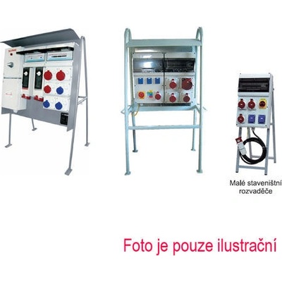 Staveništní rozvaděč s přípravou pro elektroměr na kříž, s In63A. Osazené zásuvky 2x 230V/16A, 1x 400V/16A, 1x 400V/32A, 1x 400V/63A. Jištění 2xC16/1, 1xC16/3, 1xC25/3, 1xC50/3,...