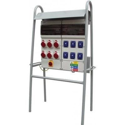 Zásuvkový staveništní rozvaděč na stojanu řady DST. Osazené zásuvky 6x 230V/16A, 2x 400V/16A/5p, 4x 400V/32A/5p. Jištění 6xB16/1, 2xC16/3, 4xC32/3, 1xFI-40/4/003,...