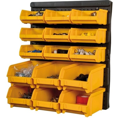 · stěna z polypropylenu černé barvy · rozměry stěny š x v: 323 x 385 mm · plastové boxy z polypropylenu žluté barvy · 9 ks boxů rozměrů: 100 x 95 x 50 mm · 6 ks boxu rozměrů:...