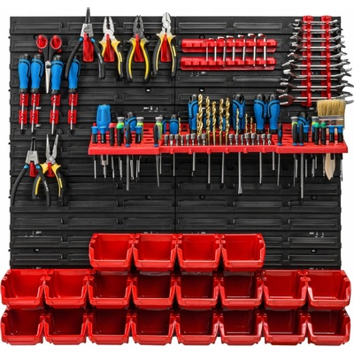 STĚNA NA NÁŘADÍ 39 X 39CM + 25 BOXŮ RED Závěsná stěna na nářadí je skvělý způsob, jak ušetřit prostor a mít přehled v nářadí a součástkách. Praktická sada pro uložení potřebného...