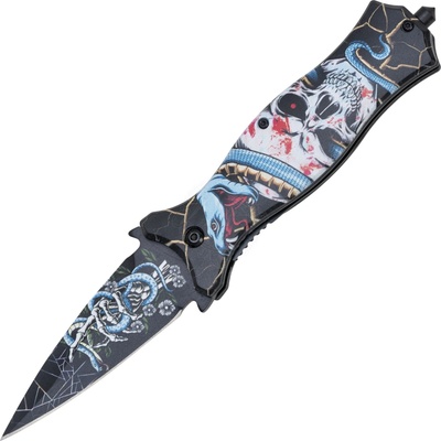 Kapesní Nůž Stiletto "Had a Lebka" Flipper Design a Vlastnosti Extravagantní dekorace: Čepel i rukojeť jsou z obou stran zdobeny digitálním potiskem s motivem kostlivce, hada a...