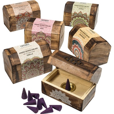 Stojan na vonné kužely truhlica + 10 kuželů, santalové dřevo, 7,5 x 4,2 x 6,5 cm Zavíratelný ozdobný dřevěný stojan s úložným prostorem umožňuje pálení vonných kuželů. Součástí...