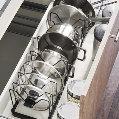 Víceúčelový úložný stojan – Pořádek ve vaší skříni Už žádný nepořádek! Tento praktický organizér vám pomůže uspořádat poklice, víčka od plastových krabiček, prkénka na krájení,...