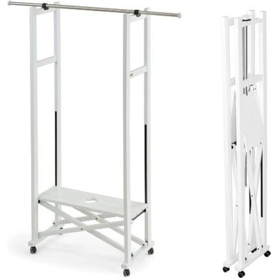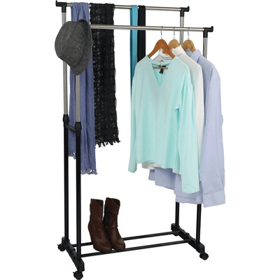 Stojan na oblečení s kolečky a dvojitými tyčemi na úložení - praktické řešení pro organizaci oděvů ve vašem domě Praktické řešení pro uložení: Stojan na oblečení WOODY o...