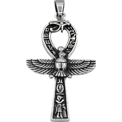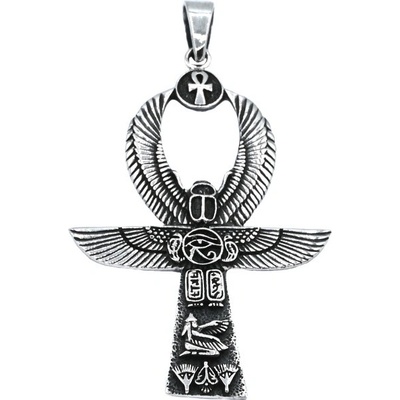 Stříbrný přívěsek Anch zdobený dalšími symboly - scarabeus, horovo oko, Isis. Rozměry: šířka x výška včetně očka 5,4 cm x 5,8 cm Vnitřní rozměry očka: 6x4 mm Váha: 6,62 g...
