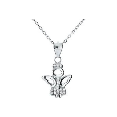 Stříbrný řetízek zdobený přívěškem ve tvaru andílka osázeného zirkony čiré barvy. Anděl má svatozář osázenou čirými zirkony, zlacenou hlavičku 14kt žlutým zlatem, hlavička ve tvaru srdce. Sukýnka je také zdobena čirými zirkony.Šperk je vyroben ze stříbra s jakostním...