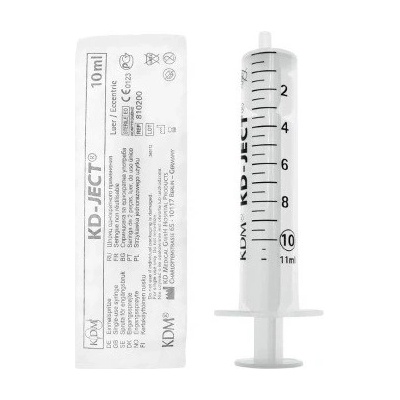 s excentrickou špičkou Injekční stříkačka 10 ml KDM Značková sterilní stříkačka KDM 10 ml. jednotlivě balená v blistru. Hladký chod pístu bez dostřiku, perfektní průhlednost a...