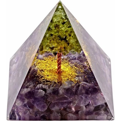 Okouzlující orgonit Strom života ve formě pyramidy. V pyramidě je strom života z měděných drátků a olivínu v ohlazených kouscích ametystu. Strom života je silným ochranným...