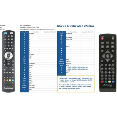 POUZE ZÁKLADNÍ FUNKCE. Náhradní dálkový ovladač Strong. Má všechny funkce jako originál. Bez nutnosti nastavování. Rozpis tlačítek přiložen. Pro Strong DVBT Prima, Prima 2,...