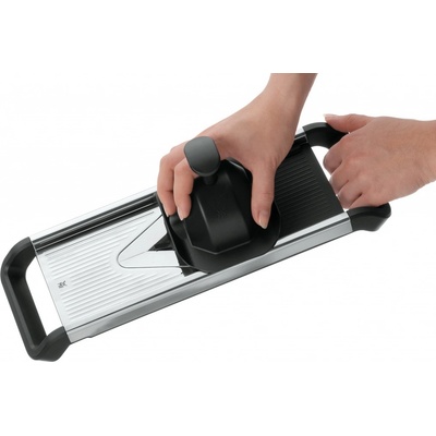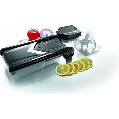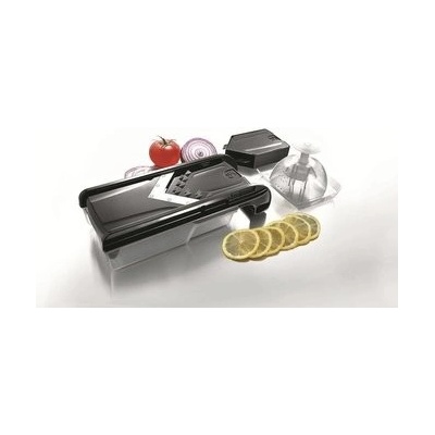 Představený kráječ s V-čepelemi má šikmou čepel z nerezové oceli. Nůž má čtyřstupňové nastavení tloušťky plátků (1,5, 3,0, 4,5 a 6,0 mm), funkci julienne (3 mm tyčinky) a funkci...