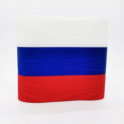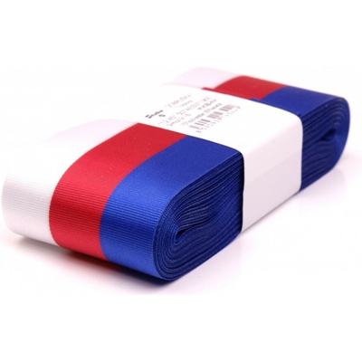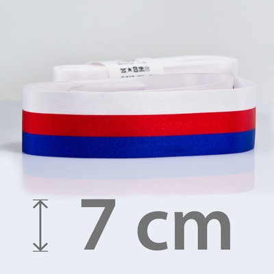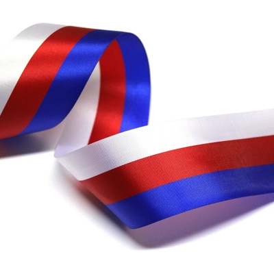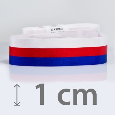 Látková trikolorová stuha v pořadí barev červená / modrá / bílá - tato kombinace odpovídá vlajkám Ruské federace a Slovenské republiky.