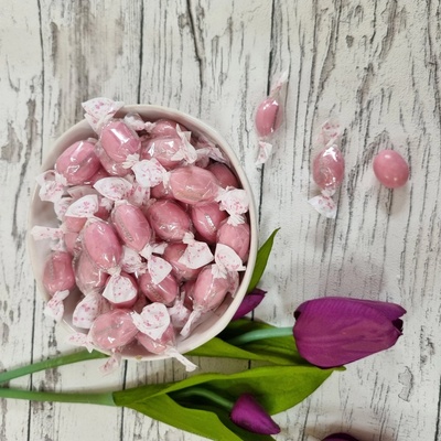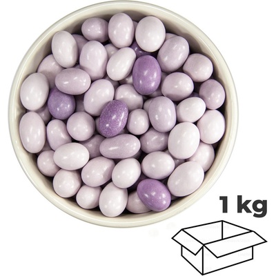 Svatební mandle ve čtyřech odstínech barvy lila a čtyřech příchutích zalitá cukrovou polevou. PŘÍCHUTĚ: Malina, modré hroznové víno, Marakuja, jogurt s borůvkou ROZMĚR: cca 3...