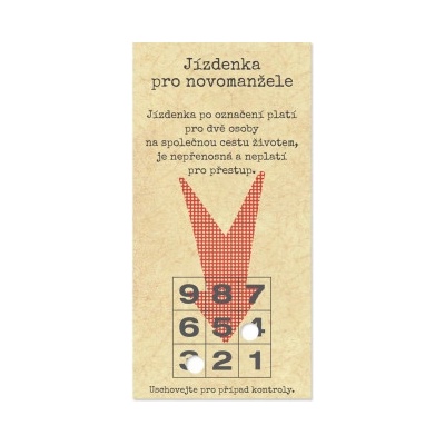 Žádný svatební dar se neobejde bez svatebního přání. Svatební přání si můžete napsat sami osobně nebo využít již předepsané texty. Na tomto přáníčku naleznete: Jízdenka pro...
