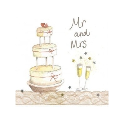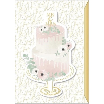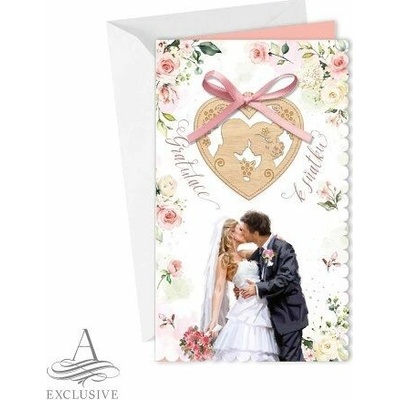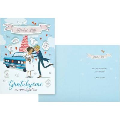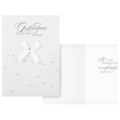 Přání s textem svatební s obálkou. Rozměr: 115 x 170 mm (ve složeném stavu)Text na přední straně:GratulaceText uvnitř přání:Blahopřejeme k Vaší krásné svatbě.
