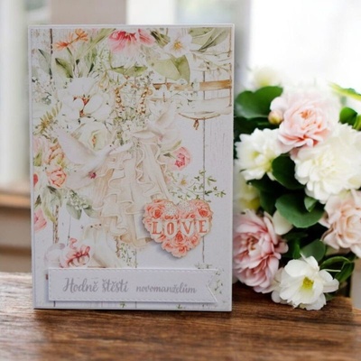 Luxusní ručně vyráběné svatební přání (velikost A5) Toto jedinečné svatební přání zaujme svou romantickou estetikou, která spojuje jemné květinové motivy, pastelové tóny a...