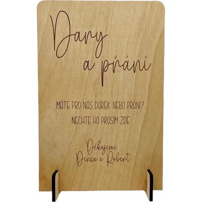 Dřevěná cedulka na označení místa pro dary a přání na vaší svatbě Očekáváte na svatbě přání, dary nebo obálky? Zvolte jedno místo, kam mají hosté dary a přání pokládat....