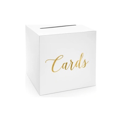Papírová truhlice v bílé barvě se zlatým nápisem Cards vhodná na jakoukoliv svatbu na přání. Velikost: 24 x 24 x 24 cm. Balení: 1 ks.