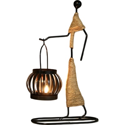 Dekorační svícen ve tvaru africké dívky. Do svícnu lze umístit klasické čajové svíčky. Svícen je vyroben z černě nabarveného kovu, šaty dívky jsou z textilní příze.