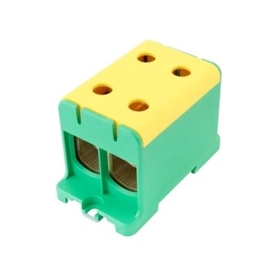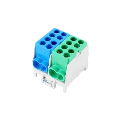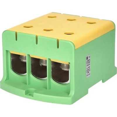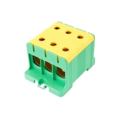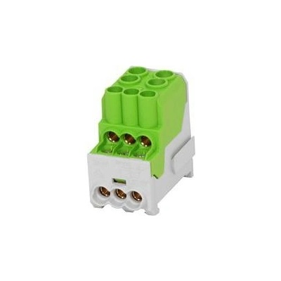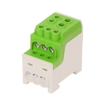 Blok pro rozdělení fází UVB 100 PE, 1pólový, jmenovitý proud 101A, jmenovité napětí 1000V, barva zelená, montáž na DIN lištu, krytí IP20, vstup 2x25mm2, výstup 6x10mm2, řaditelný.