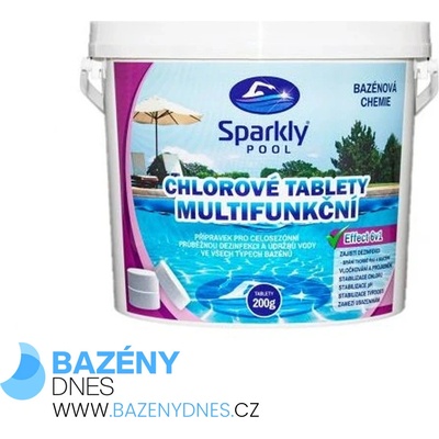 Chlorové tablety do bazénu 6v1 multifunkční 200 g 1 kg - SPARKLY POOL Chlorové tablety multifunkční Effect 6v1 MAXI 200 g, je vysoce účinný beze zbytku pomalurozpustný...