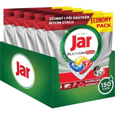 Jar Platinum Plus Lemon tablety do myčky 150 ks ZÍSKEJTE DOKONALOU ČISTOTU I PŘI KRÁTKÝCH CYKLECH. Objevte kapsle vše v jednom Jar Platinum Plus All in One do myčky nádobí –...