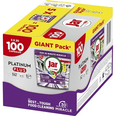 Jar Platinum Plus 30 Minute Miracle tablety do myčky 100 ks VAŠE ZÁZRAČNÉ ŘEŠENÍ VŠE V JEDNOM PRO ZÁŘIVÉ NÁDOBÍ BEZ NÁMAHY. Objevte Jar Our 30 Minute Miracle Platinum Plus,...