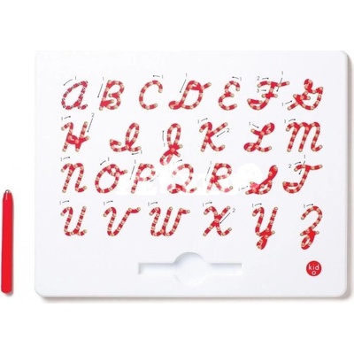 Kid O magnetická tabulka pro nácvik správného psaní velkého psacího písma složená z magnetických kuliček a pera.