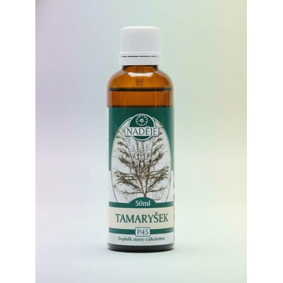 Doplněk stravy Naděje P45 Tamaryšek 50 ml. Tinktura z pupenů tamaryšku. Účinný adaptogen, regenerace duševní a tělesné kondice, posílení fyzické i psychické odolnosti organismu, podpora jaterní funkce, trávení a pročišťování těla. Keř rostoucí v písčitých půdách s...