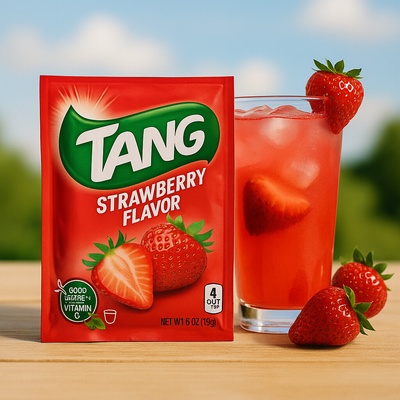 Legendární instantní nápoj Tang s příchutí jahody. Určeno pro přípravu 1l nápoje. Složení: cukr, kyselina (kyselina citronová), regulátor kyselosti (citronany sodné), zahušťovadlo (karboxymethylcelulóza), protispékavá látka (fosforečnany vápenaté), aroma, sladidla...