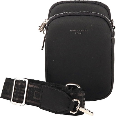 Dvouoddílová malá crossbody kabelka - taštička - David Jones v černé barvě - opatřena moderním látkovým popruhem s potiskem - na čele taštičky je umístěno stříbrné logo...