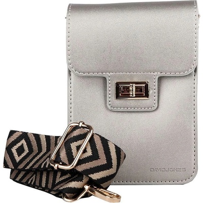 Malá pevná crossbody kabelka - taštička - David Jones ve stříbrné barvě - opatřena moderním látkovým popruhem s potiskem - na čele taštičky je vyraženo logo značky - uzavírá...