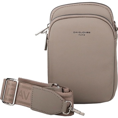 Dvouoddílová malá crossbody kabelka - taštička - David Jones v šedo-hnědé barvě - opatřena moderním látkovým popruhem s potiskem - na čele taštičky je umístěno stříbrné logo...