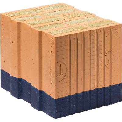 soklová tepelněizolační cihla s vyšší pevností a minerální izolací, ke zdění na zakládací maltu, pevnost v tlaku 10 MPa, součinitel prostupu tepla 0,23 W.m-2.K-1, spotřeba 16...