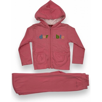 Krásný komplet se skládá z mikiny, tepláčků a trika s dlouhým rukávem. Mikina je s kapucí, na zapínání na zip v barvě růžové, medové a smetanové. Mikinku zdobí zelené nabírané...