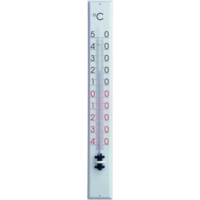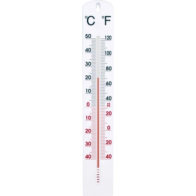 Venkovní závěsný teploměr s přehlednou stupnicí. Teplota může být odečtena ve stupních Celsia (levá stupnice) i Fahrenheita (pravá stupnice). rozměry (Š x H x V): 65 x 10 x 400 mm rozsah měření: -40 °C až +50 °C materiál: plast barva: bílá