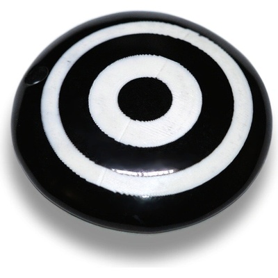 Kolečko černé, akrylové s bílým terčem. Z jedné strany vypouklé, z druhé strany rovné, hladké a bez terčíku. Rozměr: 33x5 mm Velikost dírky: 3 mm Cena je za jeden kus.