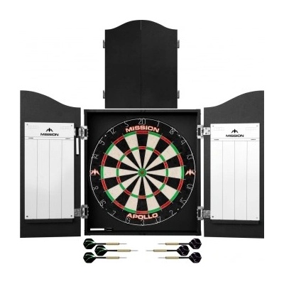 Mission Home Darts Centre je sada, která obsahuje kabinet s tabulkou pro zápis skóre (uvnitř dvířek), sisalový terč s kulatými dráty Apollo, 2 sady mosazných šipek (tj. 6 ks) a...