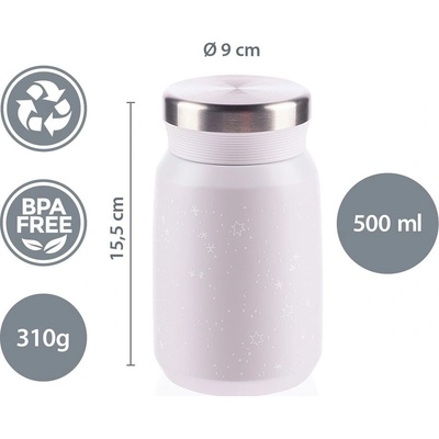Termoska na jídlo nebo na zmrzlinu se šroubovacím uzávěremí. Dvojitá stěna udržuje teplotu po dobu až 8 hodin. Plášť termosky i vnitřní nádoba jsou vyrobeny nerezové oceli....