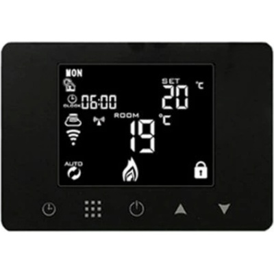 Moderní chytrý WiFi termostat s kapacitním dotykovým ovládáním ve hranatém designu, určený pro kondenzační kotle, plynové kotle, elektrokotle a další systémy s beznapěťovým...