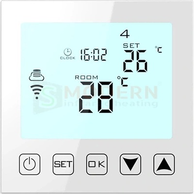 Moderní chytrý WiFi termostat s kapacitním dotykovým ovládáním ve hranatém designu, určený pro kondenzační kotle, plynové kotle, elektrokotle a další systémy s beznapěťovým...